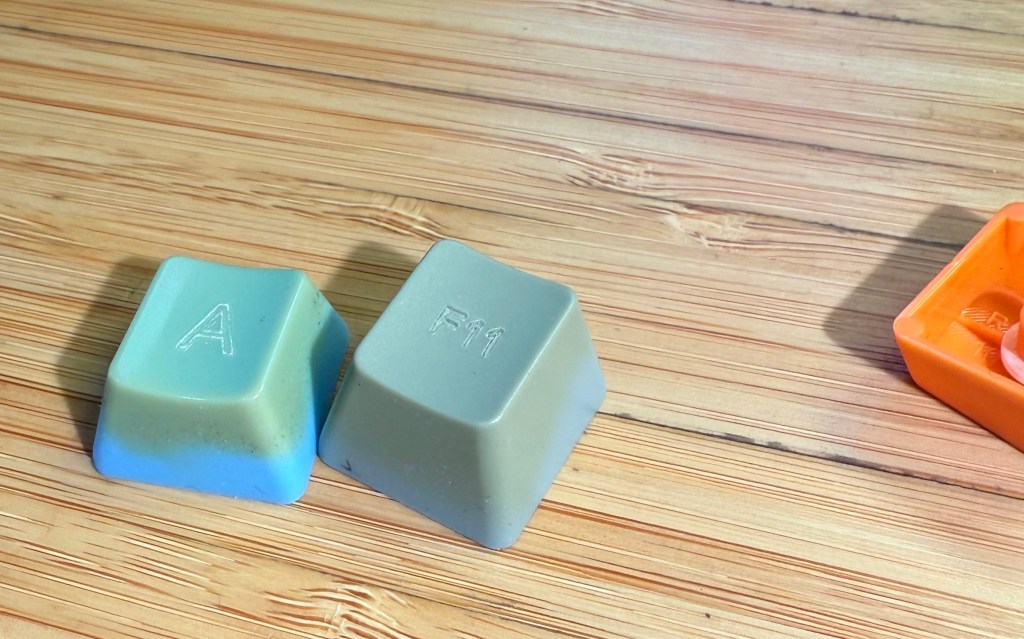 The keycaps turned out not to be very high quality. The etched legends felt rough, especially at first. I thought that some kind of finishing could have helped with this, but tellingly I haven’t noticed similar etched keycaps from any other vendors, so it may just be impossible to do nicely. I also spent the first few years with my desk in a challenging environment, where the keyboard was in almost daily, direct California sunlight. This, I believe, seriously discolored the keycaps (most noticeably the blue and grey ones). They looked disgusting and I worried that I must have especially filthy hand sweat or something. No amount of dish detergent or other soaps would remove the “stain”, though, and I eventually figured out that this yellowing is the behavior of additives and coatings meant to protect plastic from UV light.