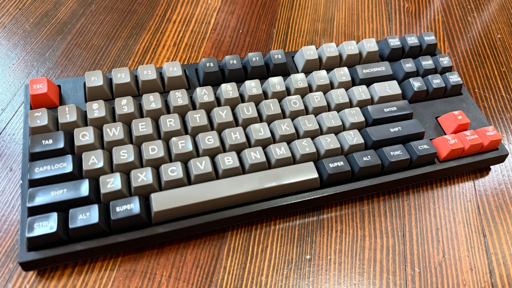 Eons ago (~2013), my spouse suggested a mechanical keyboard as a gift idea for me. It was a good idea! By then I had pivoted from freelance miscellany to a steady programming job, and having nice tools for the trade seemed appropriate. I got a switch tester, I researched, and ended up selecting a WASD (spouse’s initial recommendation) V2 87-key / “tenkeyless” keyboard with Cherry MX Blue switches and a set of custom, etched-label keycaps in a custom blue/grey/orange color scheme.